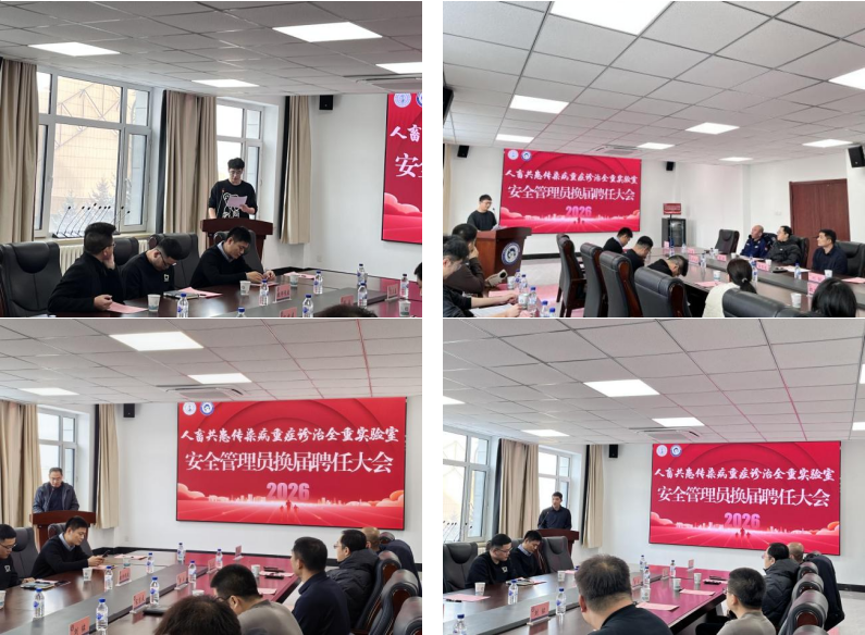 为进一步加强实验室安全管理和安全文化建设,确保实验室安全稳定运行,1月15日下午,人畜共患传染病重症诊治全国重点实验室组织召开了实验室安全管理员换届聘任大会。学院党委副书记刘铭老师、副院长董兵老师、全重实验室专职副主任宋吉武老师、实验室管理处安全管理科科长侯震老师、西区保卫办公室范立鑫老师,以及2024届、2025届实验室安全管理员、全重实验室各课题组教师代表、全重实验室相关工作人员参加了此次会议。会议由综合办公室张旭老师主持。